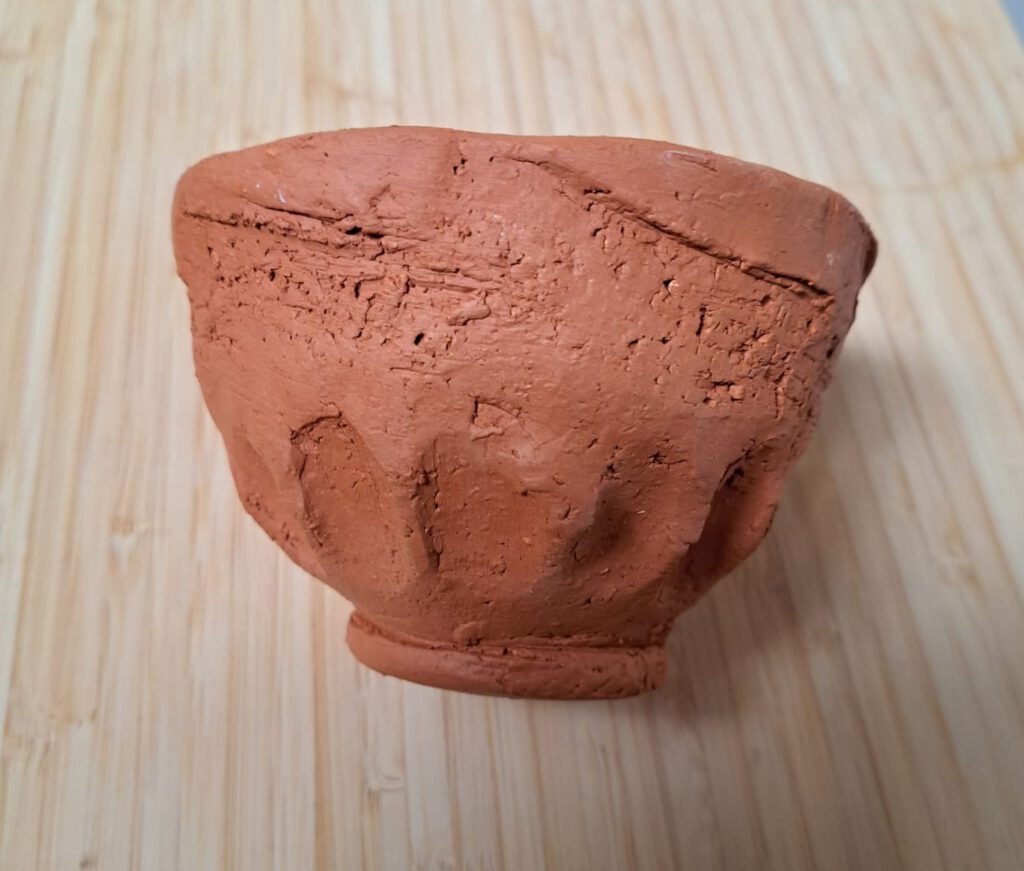 Ook nu weer wordt een vaas of kommetje gekleid met grove klei, tijdens het eerste dagdeel van de workshop. Na een droogperiode wordt het in de gewone keramiek oven gestookt.